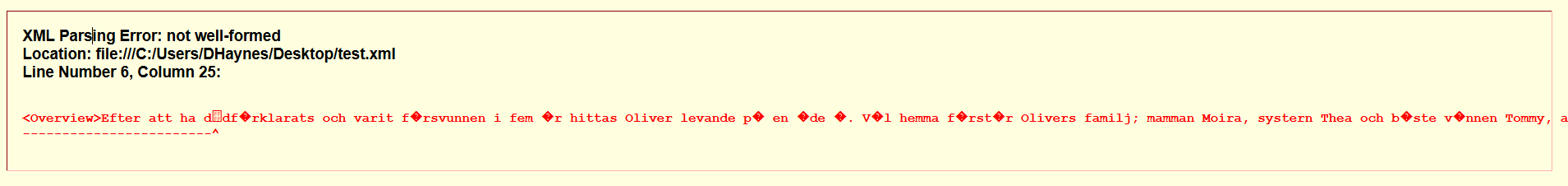 Here is the original content, save into an xml file then load in your browser to see the issues: