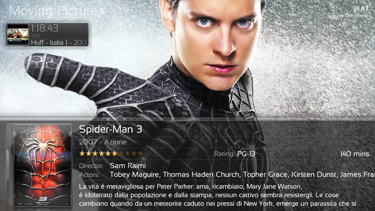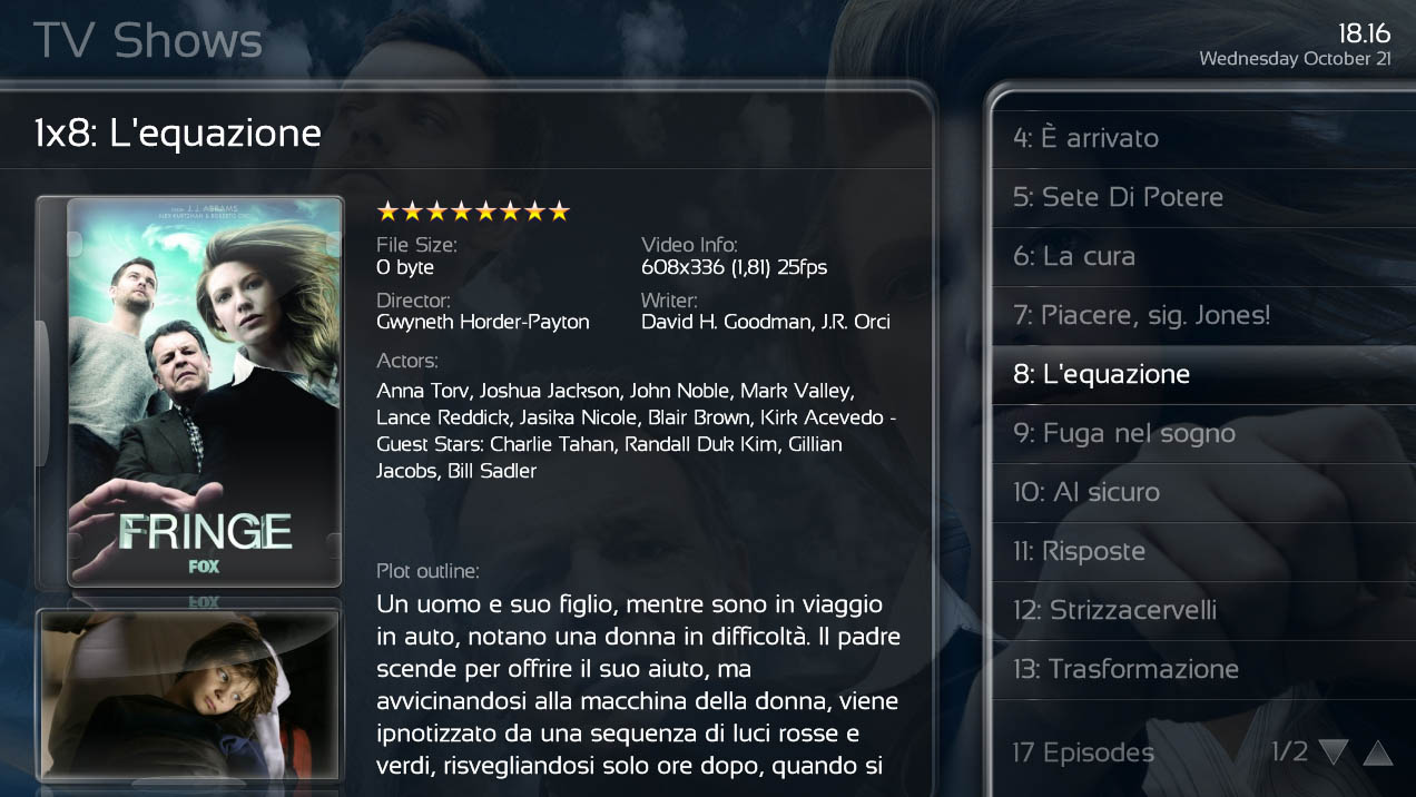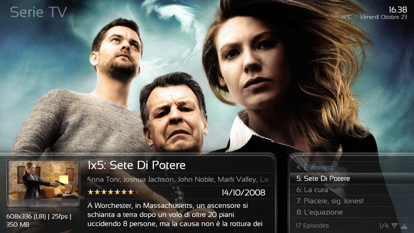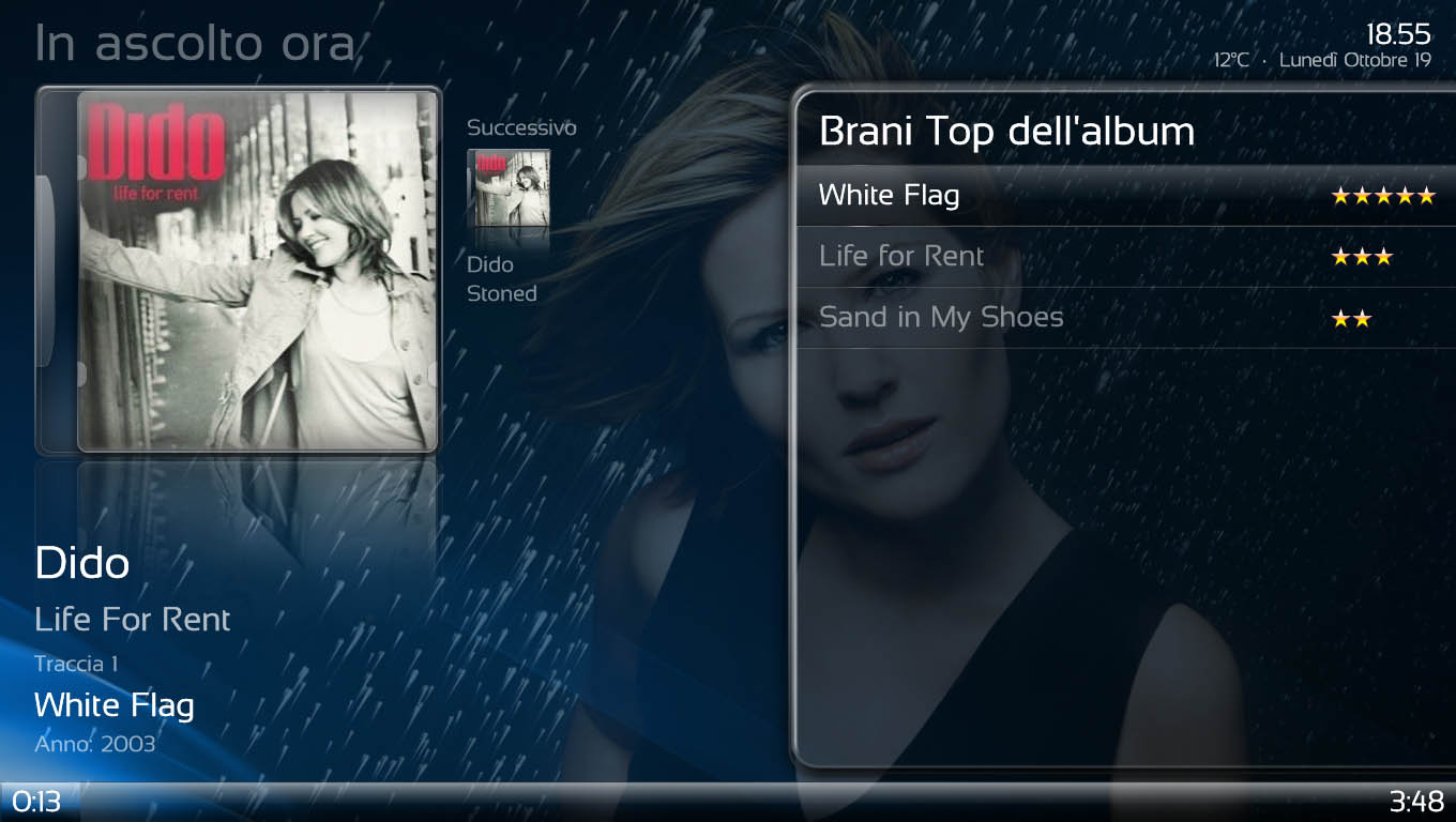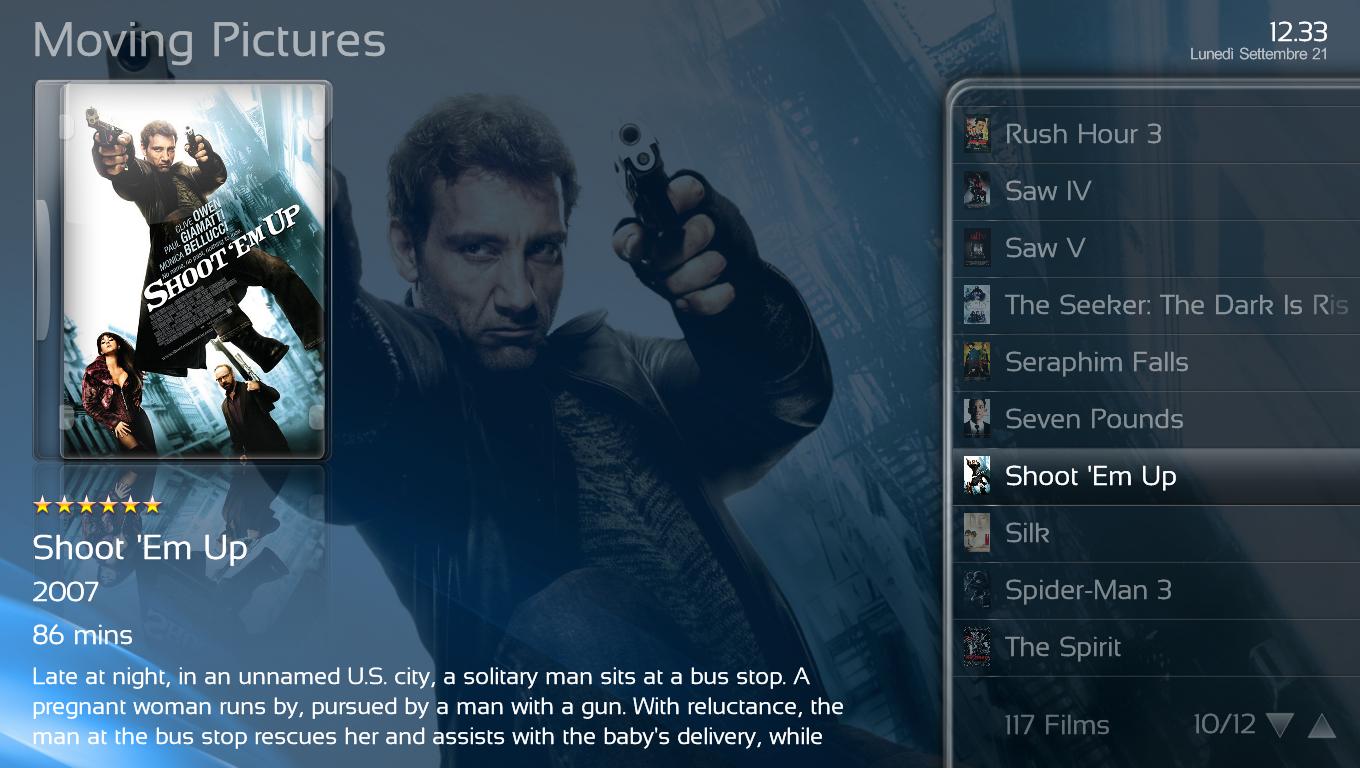 • 1.5.0 - 09/10/2009 - Major redesign of TV and Video OSD, now it supports A/V Delay, Subtitles management and more. Added support for fanart in MusicSongs, MusicGenres, MusicPlaying, MyLyrics, MusicPlaylist, Video and VideoTitles sections (thanks to ysmp). Added support for: MyTorrents, Sleep Control and MediaSlayer (thanks to -Manfred-) plugins. Reworked gfx and facadeview for Tv Recordings, MyVideos, MyVideoTitles, MyMusic. New sound scheme. Added Infoservice's Current Temperature in right upper corner. Little enhancements in: Moving Pictures details (added movie rating), paused osd gfx, in BasicHome (big font alignment). Fixed bugs in: DVD/drive select dialog (thanks to -Manfred-), TvSeries genres view (thanks to ChriZ), MyLyrics LRC submit status text (thanks to Mackey).