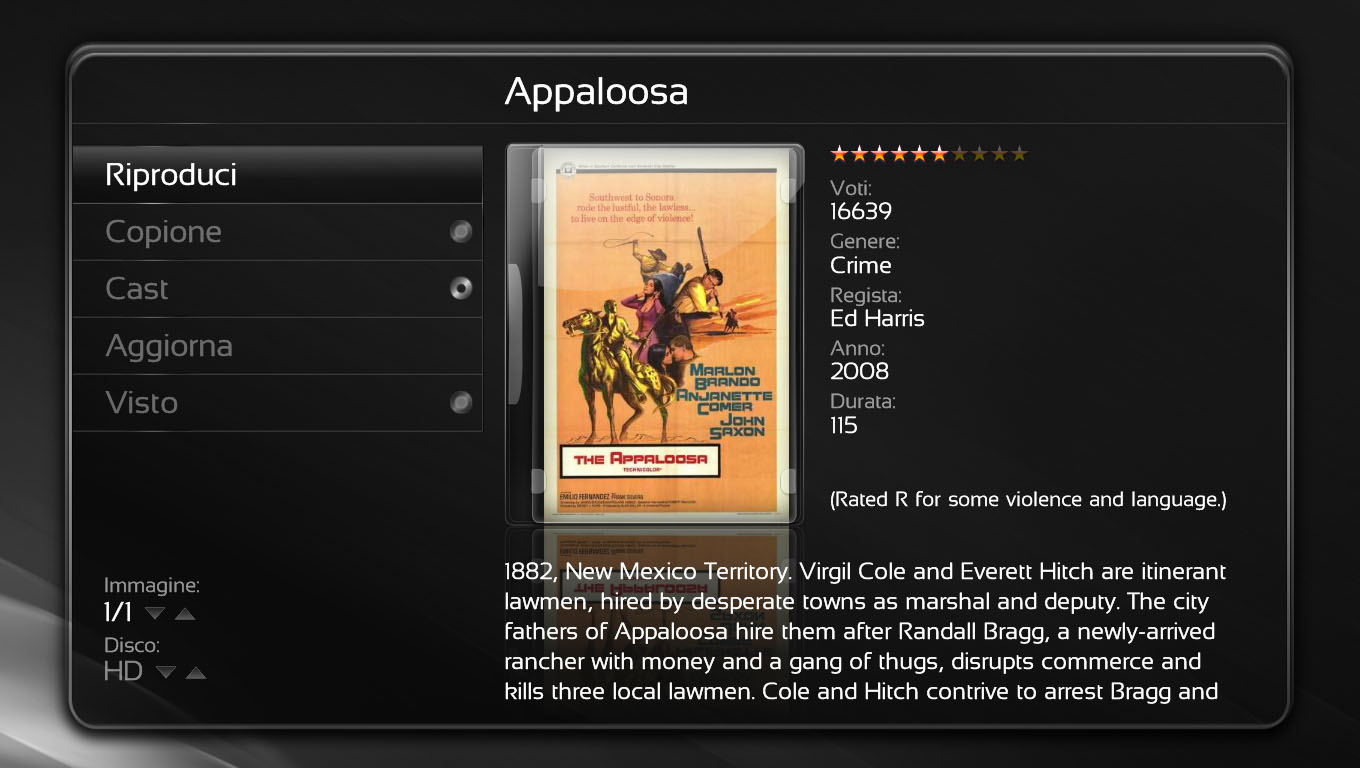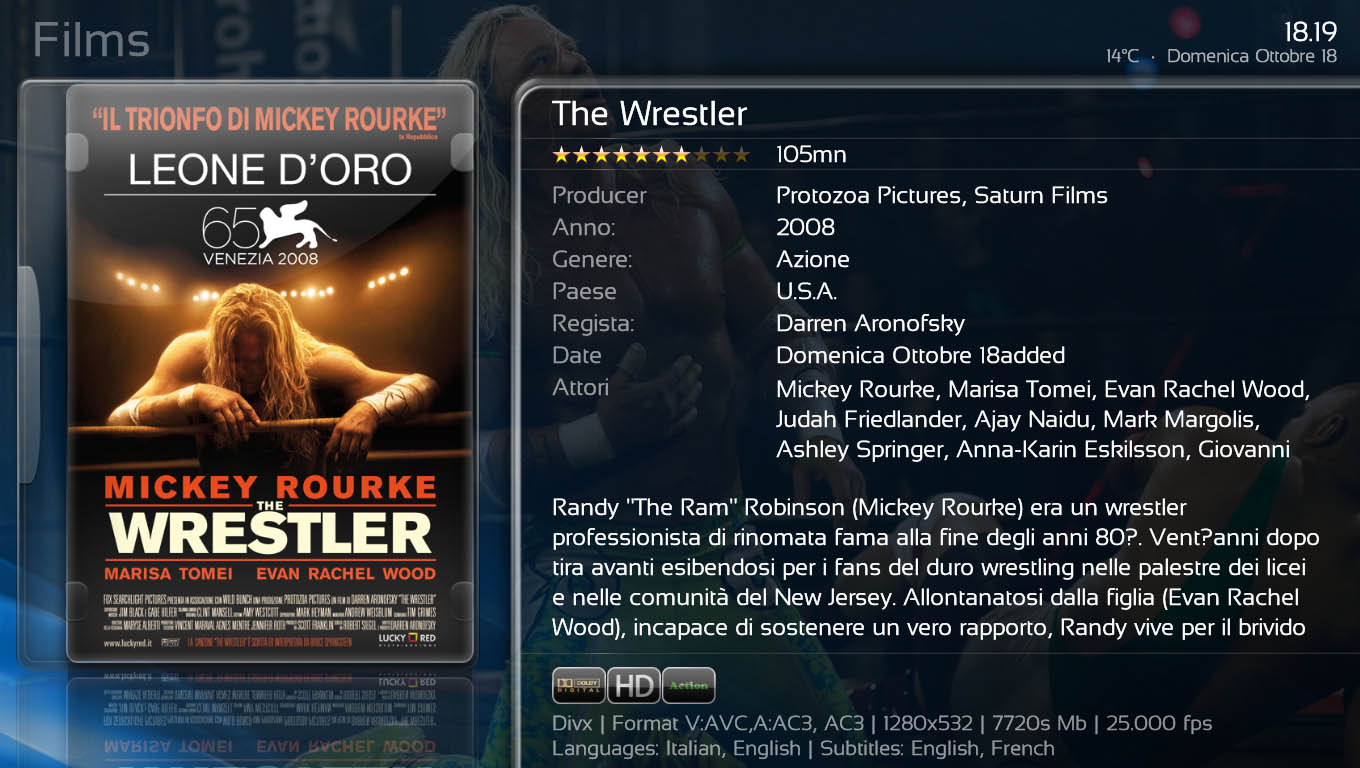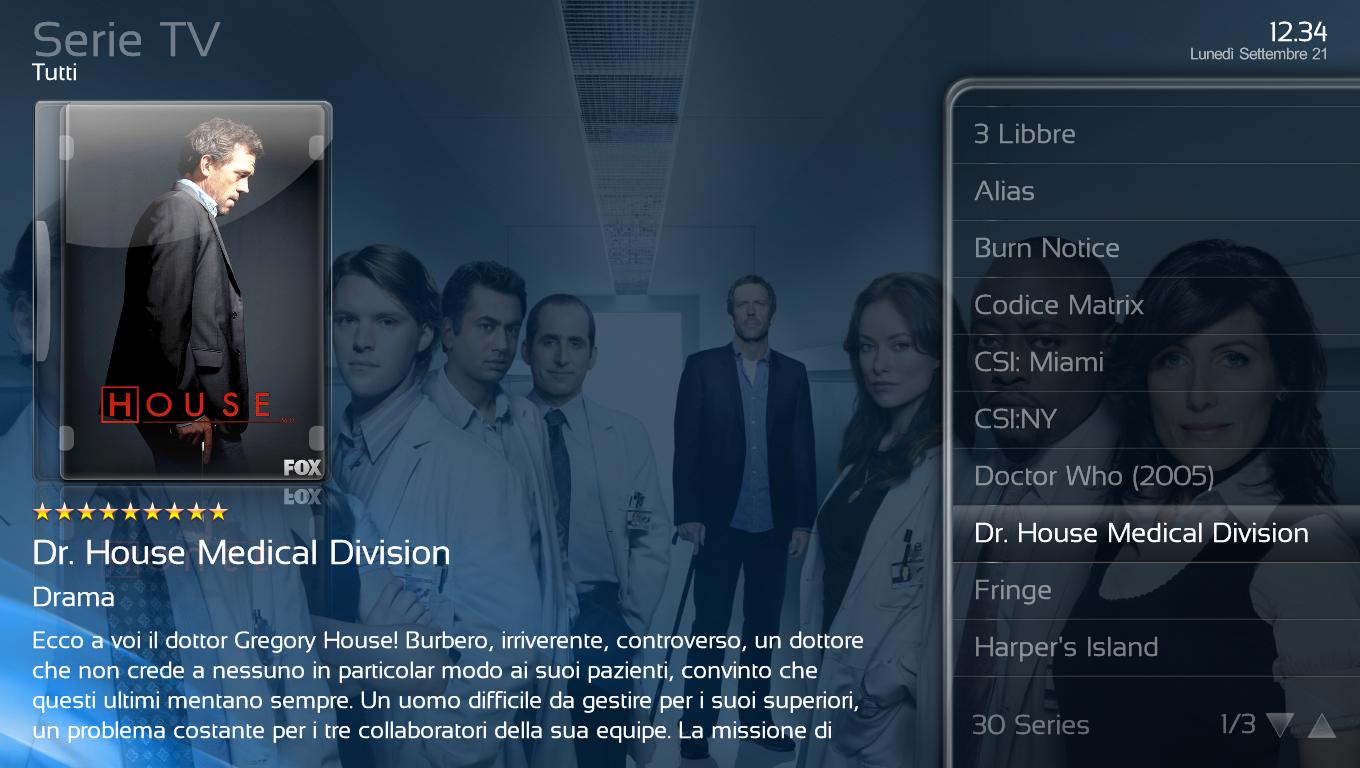 • 1.1.1 - 01/09/2009 - MyHome Mod: new home screen with new hover backgrounds. TvSeries Mod: simplified and full info support. Fixed bugs in: MyLyrics (thanks to Jammyz), Tv Logos Osd (thanks to ChriZ), CommonInterface Menu (thanks to morpheus_xx), VideoInfo screen (thanks to -Manfred-) and recordedTV screen. Reworked graphics to reduce footprint.