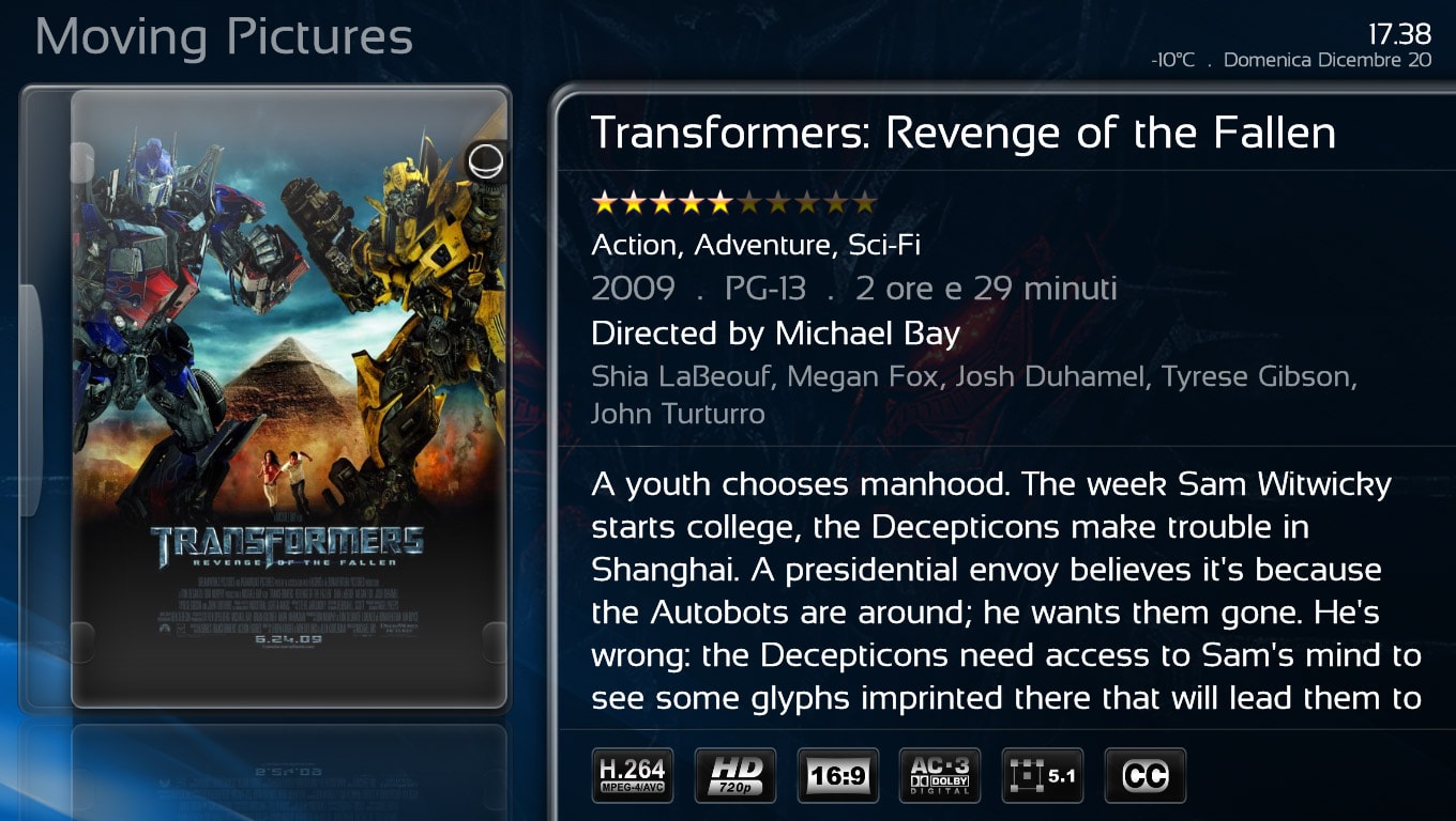 - 1.5.0 - 09/10/2009 - Major redesign of TV and Video OSD, now it supports A/V Delay, Subtitles management and more. Added support for fanart in MusicSongs, MusicGenres, MusicPlaying, MyLyrics, MusicPlaylist, Video and VideoTitles sections (thanks to ysmp). Added support for: MyTorrents, Sleep Control and MediaSlayer (thanks to -Manfred-) plugins. Reworked gfx and facadeview for Tv Recordings, MyVideos, MyVideoTitles, MyMusic. New sound scheme. Added Infoservice's Current Temperature in right upper corner. Little enhancements in: Moving Pictures details (added movie rating), paused osd gfx, in BasicHome (big font alignment). Fixed bugs in: DVD/drive select dialog (thanks to -Manfred-), TvSeries genres view (thanks to ChriZ), MyLyrics LRC submit status text (thanks to Mackey).