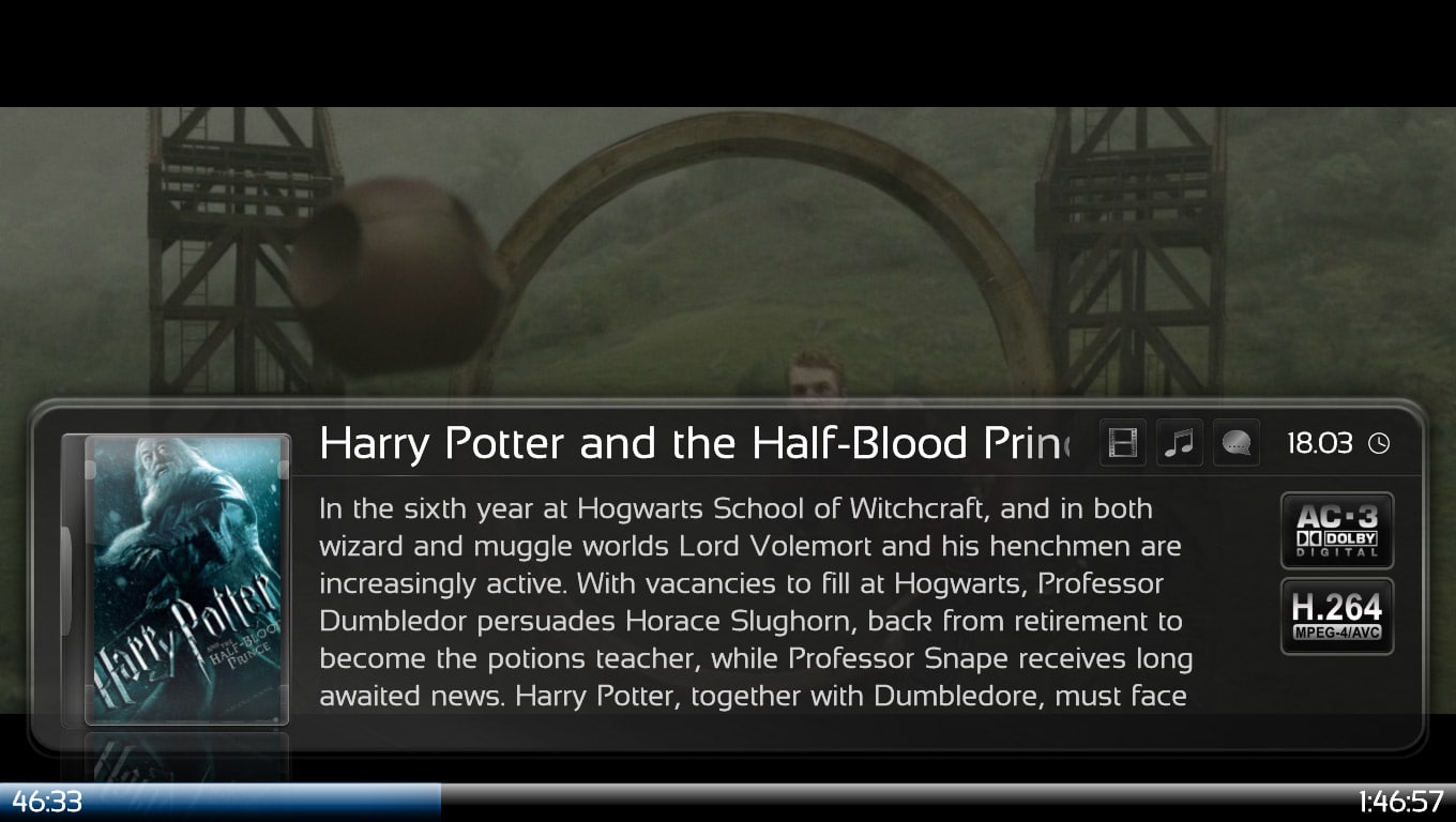- 1.4.0 - 02/10/2009 - Installation Package split in two parts: Basic Skin and Extras. Reworked paused Video/TV OSD (added time, channel and show infos. Added forward, rewind and pause gfxs). Completely reworked support for HTPCInfo plugin version 0.7.0. Added support for: TVGemist, Arcsoft player (thanks to mr viggo), MyPrograms, Youtube.fm, My Emulators plugins. New sound scheme. Enlarged myHome central panel. Fixed bugs in: TvMiniguide in FortheRecord (thanks to vuego), spinning waiting animation (thanks to mr viggo). Added new mat123's TVSeries simplified layout. Many little enhancements: listview titles, folder brackets (thanks to grabi_2001), TVSeries Season filmstrip title (thanks to mr viggo).
