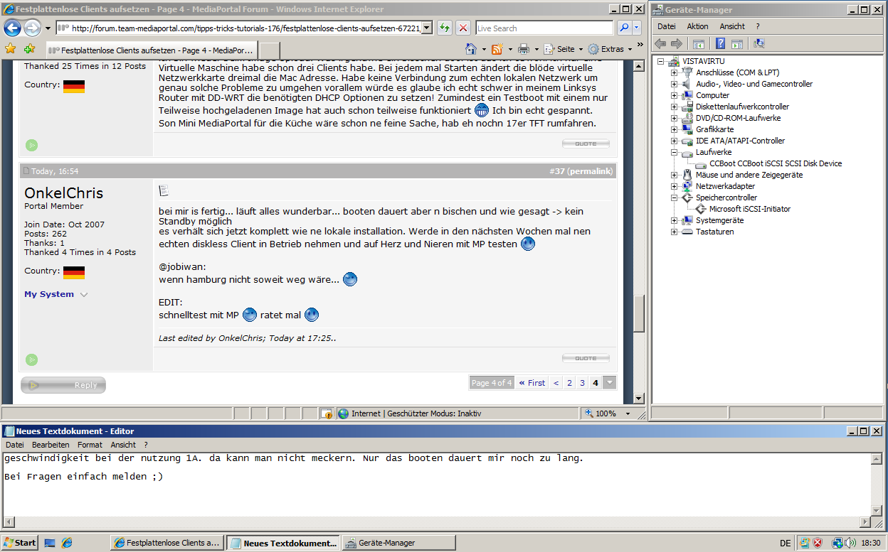 So ich bin wieder im Rennen. War zu blöde ein Diskimage einzubinden :confused: Die Dokumentation finde ich jetzt irgendwie auch nicht gerade ausführlich und die Downloadlinks funktionieren alle nicht! So ich bin wieder beim Image Upload. Was irgendwie ein bisschen doof ist das ich obwohl ich nur eine Virtuelle Maschine habe schon drei Clients habe. Bei jedem mal Starten ändert die blöde virtuelle Netzwerkkarte dreimal die Mac Adresse. Habe keine Verbindung zum echten lokalen Netzwerk um genau solche Probleme zu umgehen vorallem würde es glaube ich echt schwer in meinem Linksys Router mit DD-WRT die benötigten DHCP Optionen zu setzen! Zumindest ein Testboot mit einem nur Teilweise hochgeladenen Image hat auch schon teilweise funktioniert :D Ich bin echt gespannt. Son Mini MediaPortal für die Küche wäre schon ne feine Sache, hab eh nochn 17er TFT rumfahren.