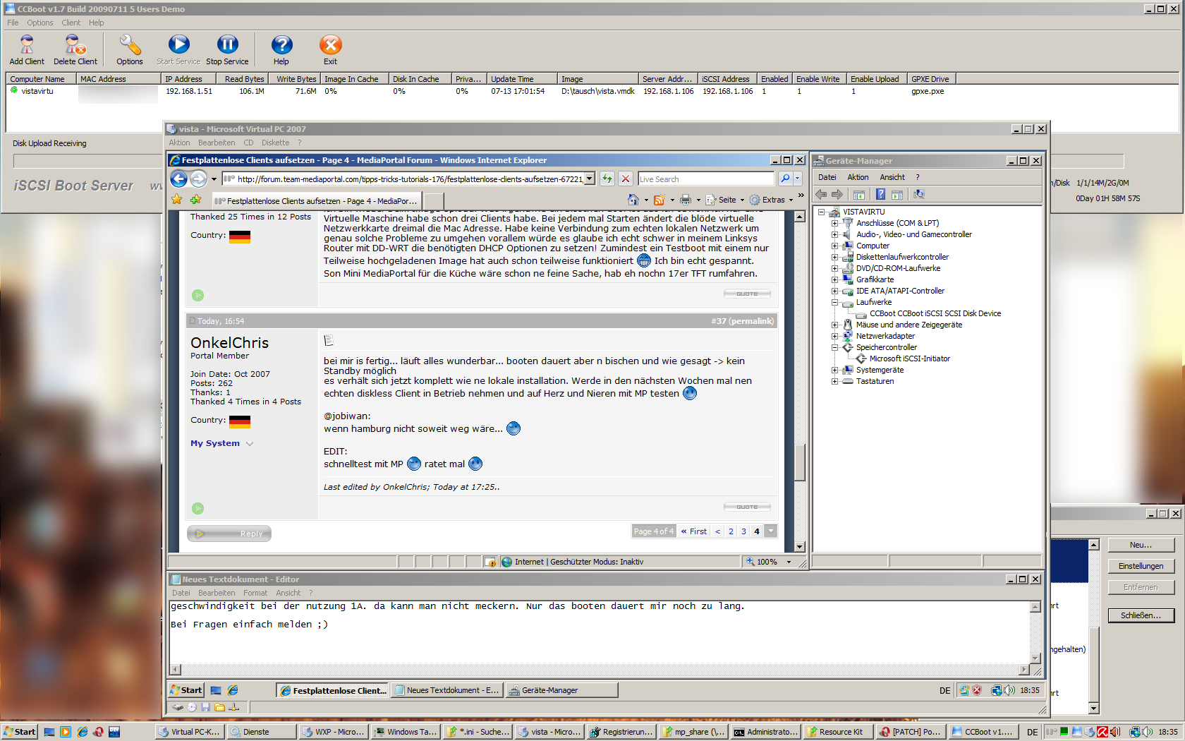 So ich habe jetzt auch mal angefangen zu testen. Blöderweise habe ich jetzt nur ein x86 Windows 7 und kann daher natürlich auch nur die x86 Versionen von Windows Vista und Windows 2003 Server testen. Egal habe mal den Virtual PC 2007 von MS runtergeladen und die Vista Enterprise VHD als auch die Windows Server 2003 R2 Enterprise Edition. CCBoot Server ist installiert und läuft. Als erstes ist mir aufgefallen das der CCBoot eigene DHCP Server ein Problem hat wenn keine IP Adressen für DNS und Gateway eingetragen sind. Dann muß ich den CCBootClient als Administrator ausführen sonst bekomme ich keine Festplatte angezeigt. Nun gut jetzt kopiert er erstmal das Image auf den Server. Ist irgendwie gerade nicht so dolle zwei Virtuelle PCs auf meinem Notebook laufen zu haben, Vista ist extrem zäh. Der Server läuft hingegen echt super. Naja ein DualCore mit 2.0Ghz und 2GB Ram sind für solche Experimente vieleicht auch etwas wenig. Bin mal gespannt was beim booten von Netzwerk passiert. Aber bis dahin können wohl noch Stunden vergehen
