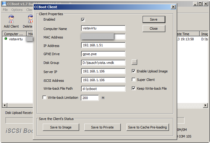 du bringst da n paar sachen durcheinander. der CCBoot-"Server" verwaltet alle Zugriffe ab dem Zeitpunkt, an dem der Client das Image verwendet. Somit muss der Haken gesetzt sein, damit der Client im Image schreiben darf. das Image per iSCSI woanders einbinden und dadrauf schreiben is nen andere schuh.