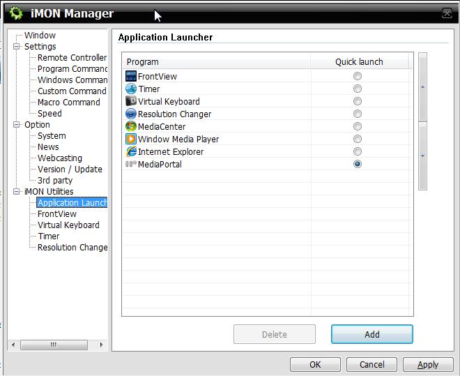 3. Under "iMON Utilities"->"Application Launcher" add MediaPortal.exe as default program (see attached picture named "Application Launcher").
