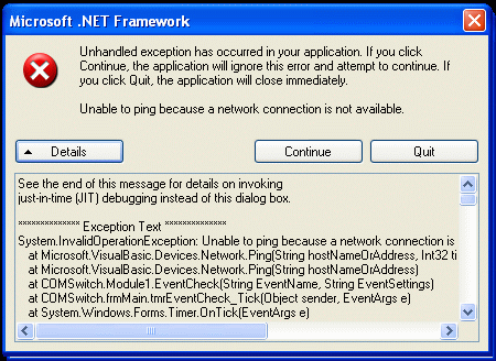 Second, I get .NET error popups occasionally. From the details (see second snapshot), it looks like COMswitch was polling something and the net link was down. This tends to happen on wake from standby (maybe a race condition?), but I'm thinking a reduce poll might improve or cure this too. Note: this is ugly more than anything else, if I click "Continue" on the popup, most times everything seems to work fine.