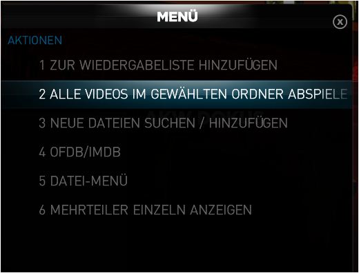 Wenn ich im Video-Ordner bin, gehe ich ins Menü "aktuelle Wiedergabeliste", da habe ich aber nur die Auswahl zwischen "Ansicht, Zufällige Reihenfolge, Wiederholen ein/aus, Speichern, Gespeichterte Listen"...
