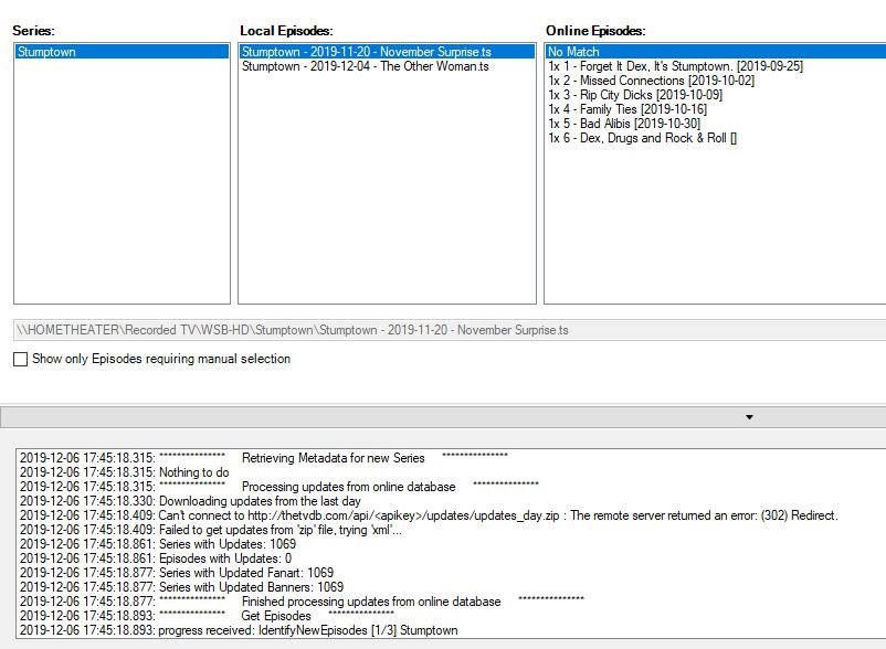 The new updates have worked for me to download episodes but I have a strange problem. I have 2 computers running Mediaportal 1.23 and TV-Series. One is downloading the online episodes for Stumptown and the other stops at Episode 6 and is missing 7 & 8. Any idea why it is not displaying the last 2 episodes so I can match them?