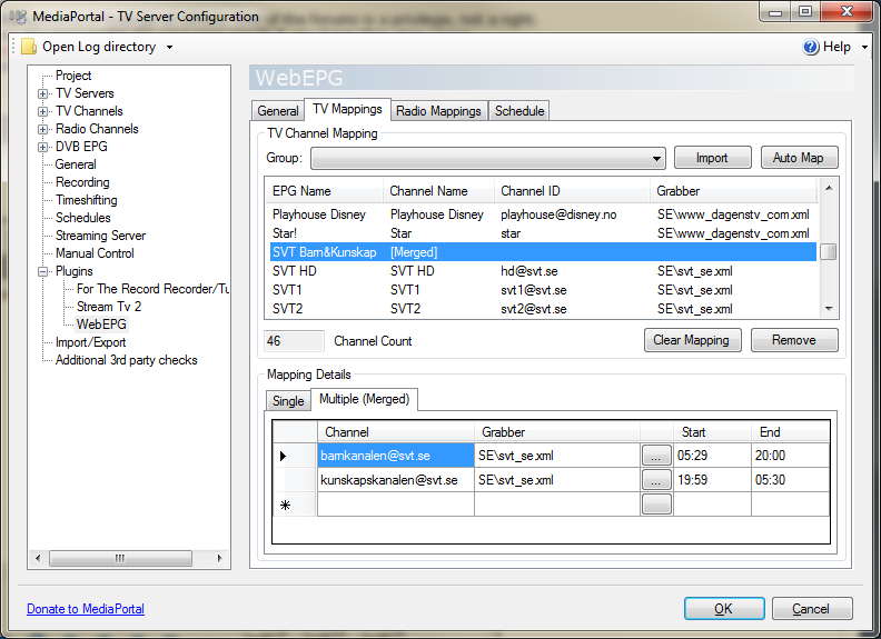 I also had problems with merging SVTB+Kunskapskanalen. I "solved" it by letting WebEPG only grab SVTB from svt_se.xml. The merged channel seemed to work in the latest SVN but I reverted back to BETA1 due to problems with livetv inside MP.