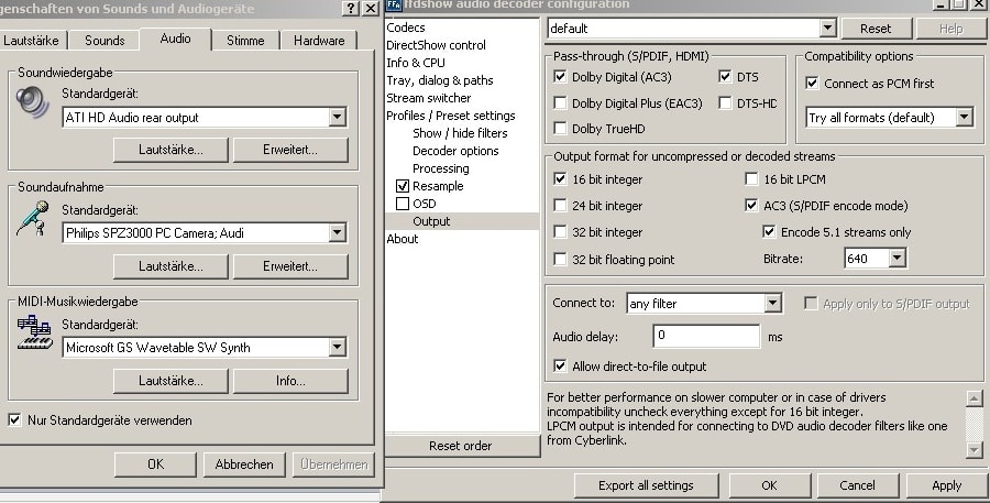All settings are set as suggested from Hoborg. So h264/x264 videos uses the ffdshow DXVA video decoder. AC3/DTS passthrough is working fine, CPU utilization is fine. The only issue is the picture is really dark. In ffdshow video decoder I'm able to modify the Output Levels and the gamma value. That's working for mpegs without any issues. But the DXVA decoder seems not to use that setting, furthermore there are no such settings in ffdshow DXVA's setting window. I can modify gamma in CCC (I use a HD3200), but that's not the perfect option, because it seems to be more an issue with the output levels. Is there any chance to set these levels? If not, can someone explain why? ;)