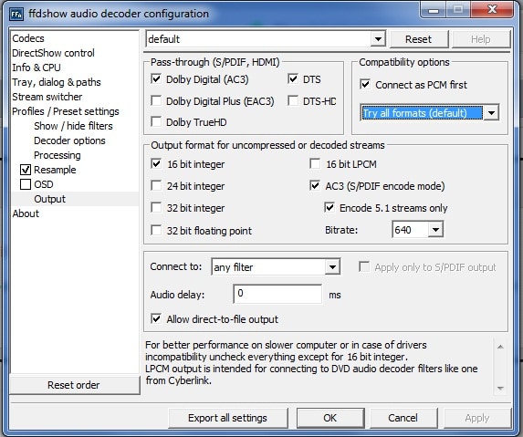 1. Audio passthrough doesn't seem to work properly as it did before. DTS is passed through correctly, but not Dolby Digital, neither 2.0 or 5.1. I deactivated postprocessing, but should I change something in the ffdshow audio configuration?