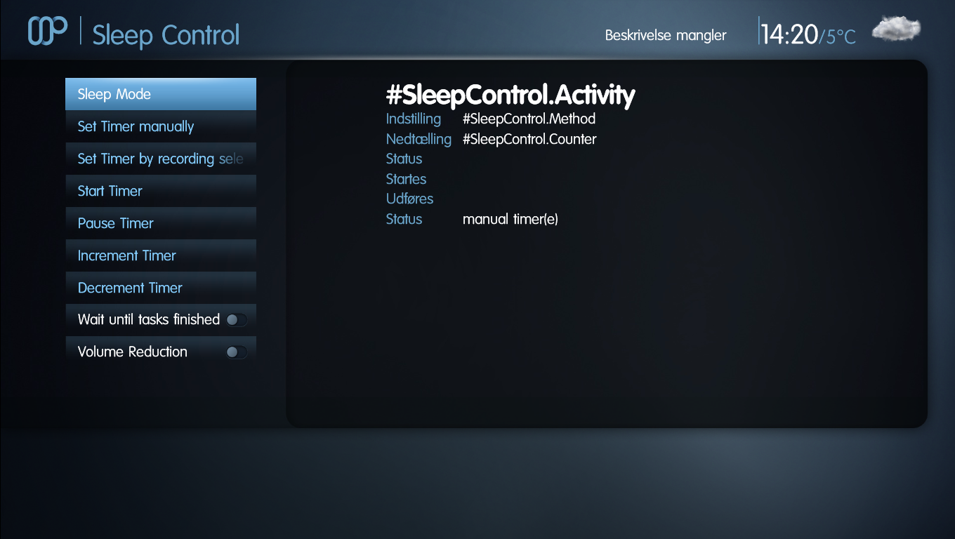 And translation in plugin is kinda half. All buttons etc. are not translated(Used the same as the skin provided, mostlikely something to do with the error above) and some values start up looking like #SleepControl.Activity and first after setting a shutdown method and starting the countdown they're properly translation.
