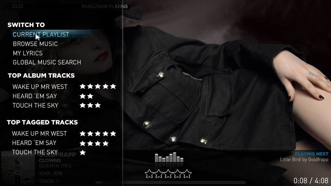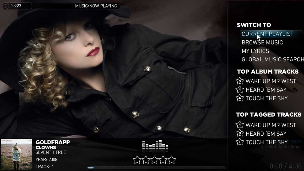 The only change I wanted to see would be loose the links to current playlist / search / lyrics, and then add them to a slideout menu like below. Focus would be on the rating, and pressing enter would toggle the ratings (0 -> 1 -> 2 -> 3 -> 4 -> 5 -> 0), and then pressing left or right will would loose focus and make the slideout menu appear. Similar style to the slideout menus in tvseries/movingpics plugins. The reason is I personally find the best track on the album text quite useful. I also think a 4th hyperlink back into musicgenres.xml would be good. Here is a quick mockup.