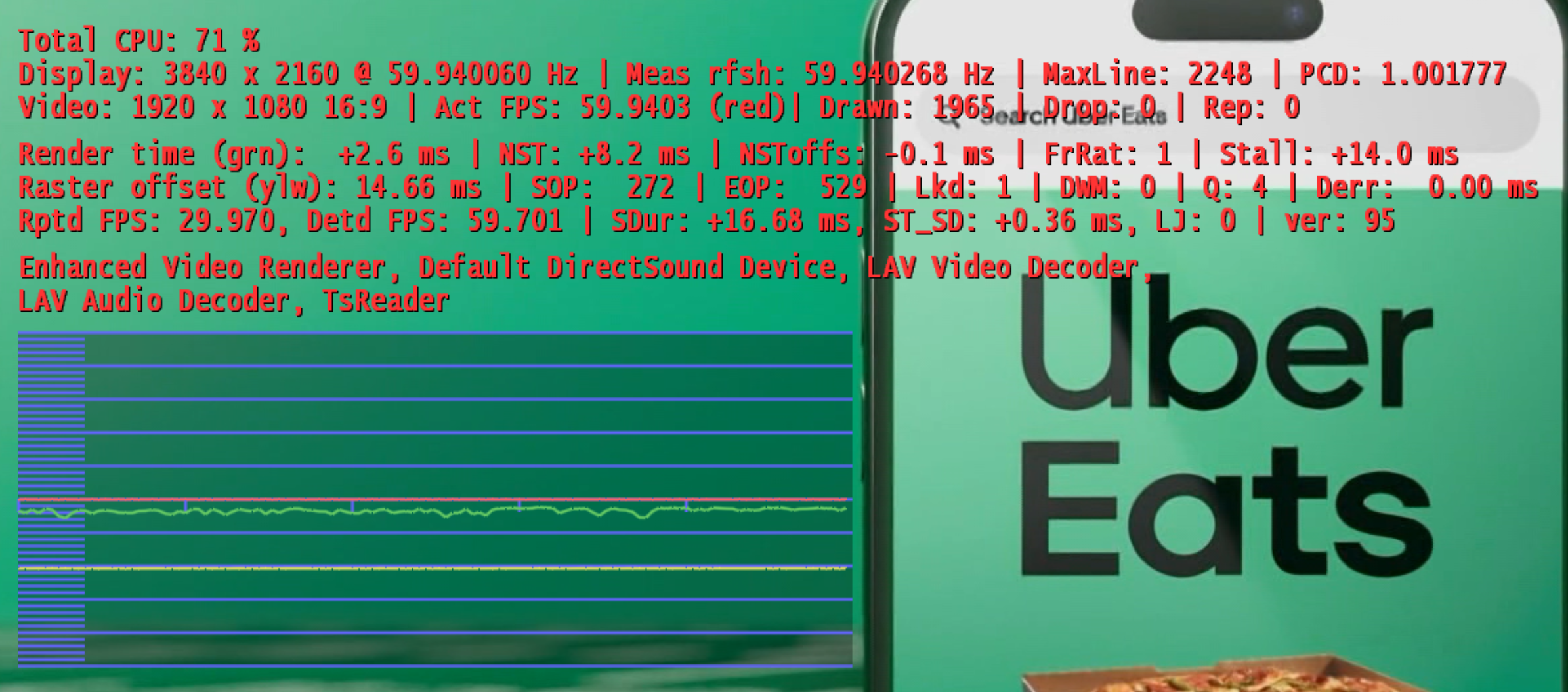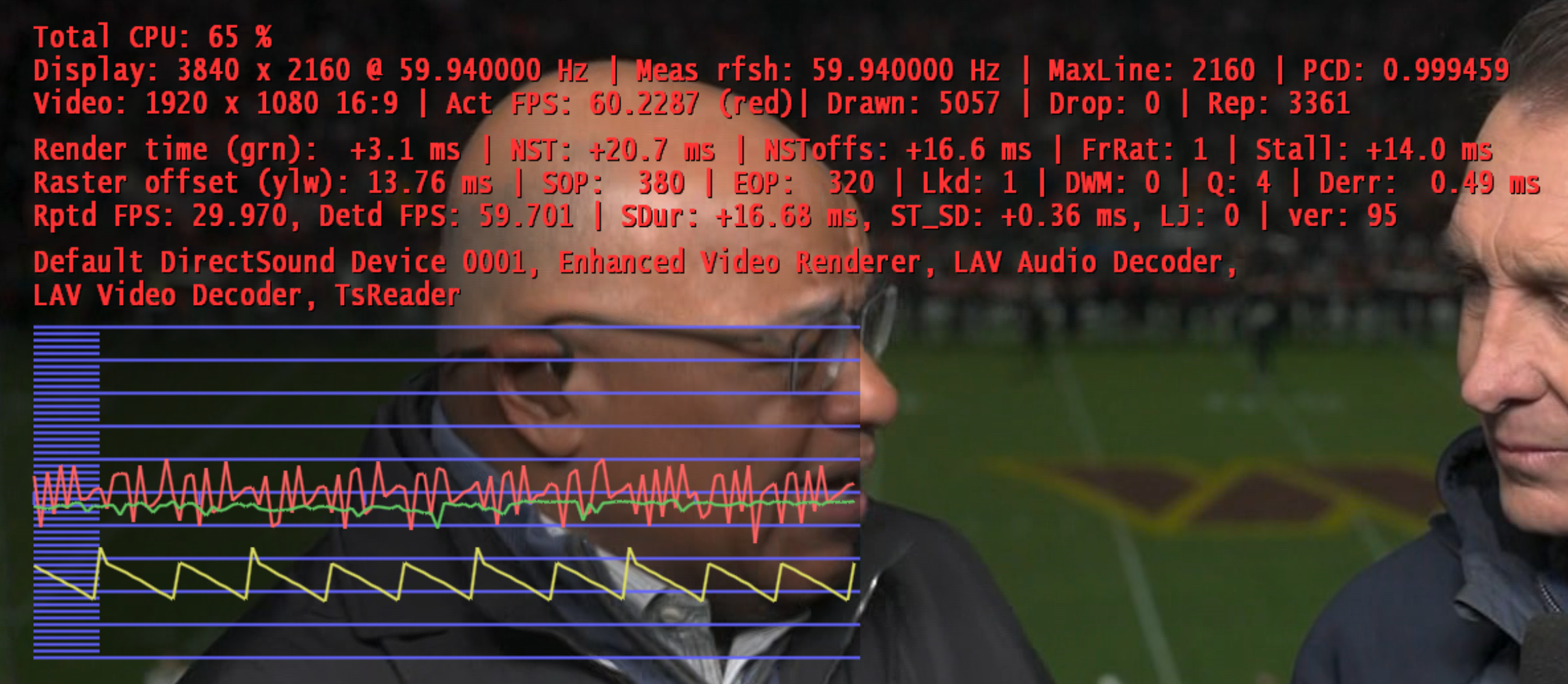 Every single time I power cycle the TV and start playing live or recorded TV from MP1 I get jittery video. Simply changing the refresh rate via Windows to 60Hz then back to 59.94 fixes the problem, even though the Shift-1 display doesn't show any change of the display refresh rate.