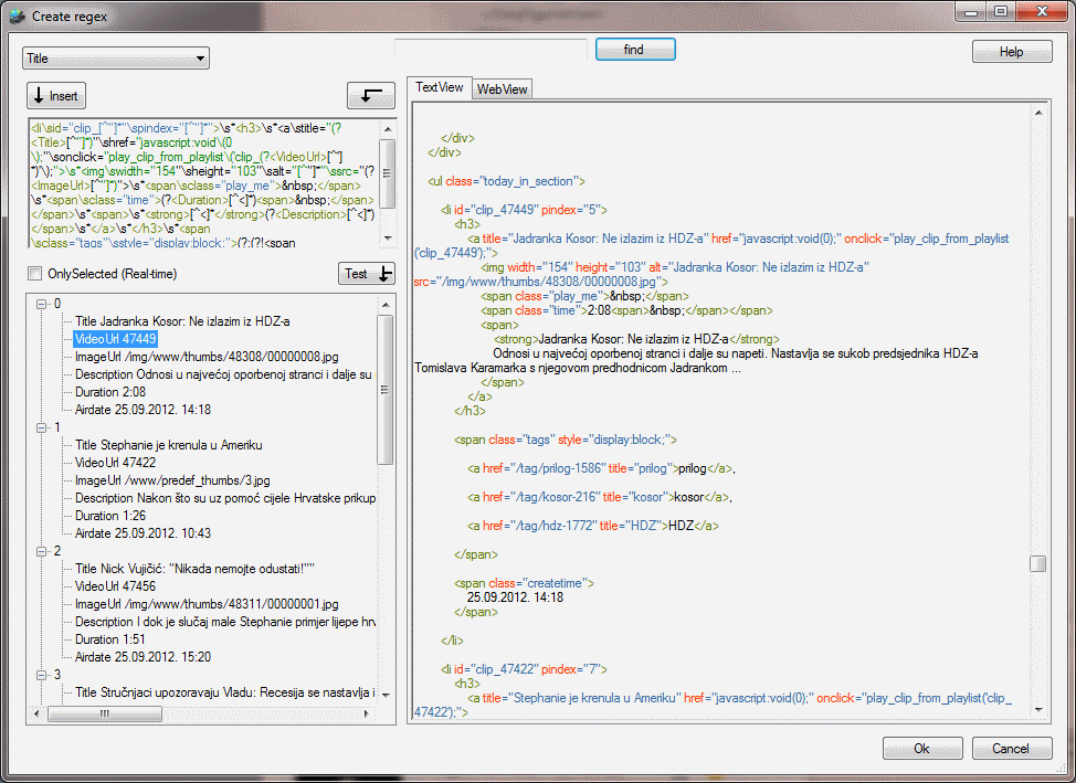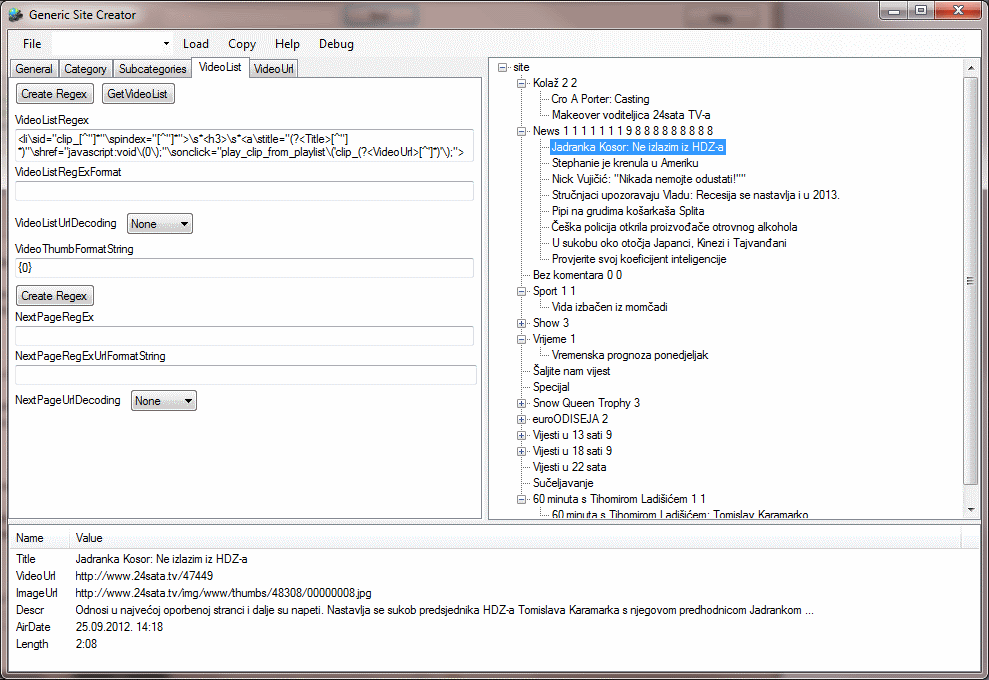 <item key="videoListRegEx"><![CDATA[<li\sid="clip_[^"]*"\spindex="[^"]*">\s*<h3>\s*<a\stitle="(?<Title>[^"]*)"\shref="javascript:void\(0\);"\sonclick="play_clip_from_playlist\('clip_(?<VideoUrl>[^']*)'\);">\s*<img\swidth="154"\sheight="103"\salt="[^"]*"\ssrc="(?<ImageUrl>[^"]*)">\s*<span\sclass="play_me">&nbsp;</span>\s*<span\sclass="time">(?<Duration>[^<]*)<span>&nbsp;</span></span>\s*<span>\s*<strong>[^<]*</strong>(?<Description>[^<]*)</span>\s*</a>\s*</h3>\s*<span\sclass="tags"\sstyle="display:block;">(?:(?!<span\sclass="crea).)*<span\sclass="createtime">[^<]*</span>\s*</li>]]></item>