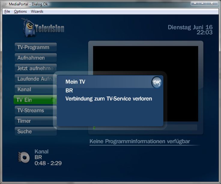 But as soon as I switch the TV to on, it takes some seconds and I get a pop up, telling me that connection to the TV server was lost (see screenshot attached. Reason why no EPG data is because I did not configure the EPG after multiple times of reinstalling MP).